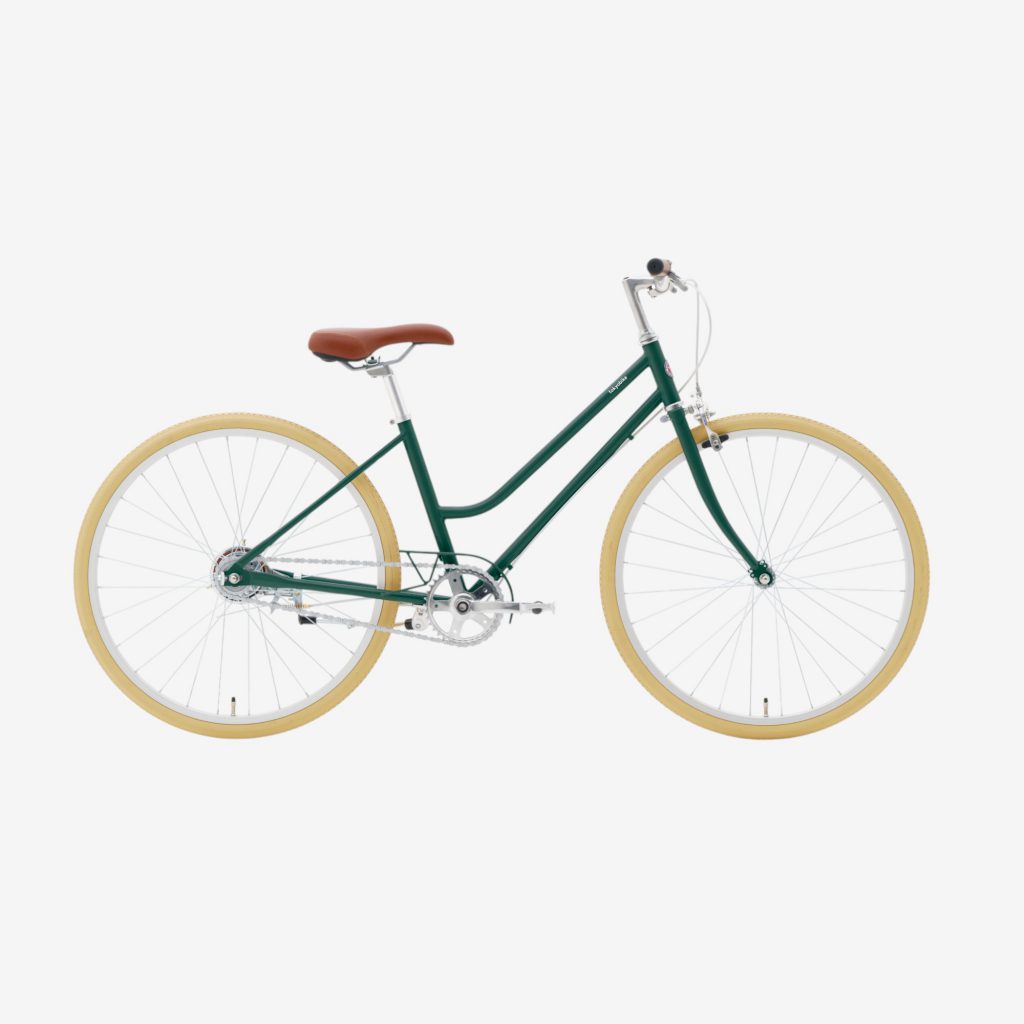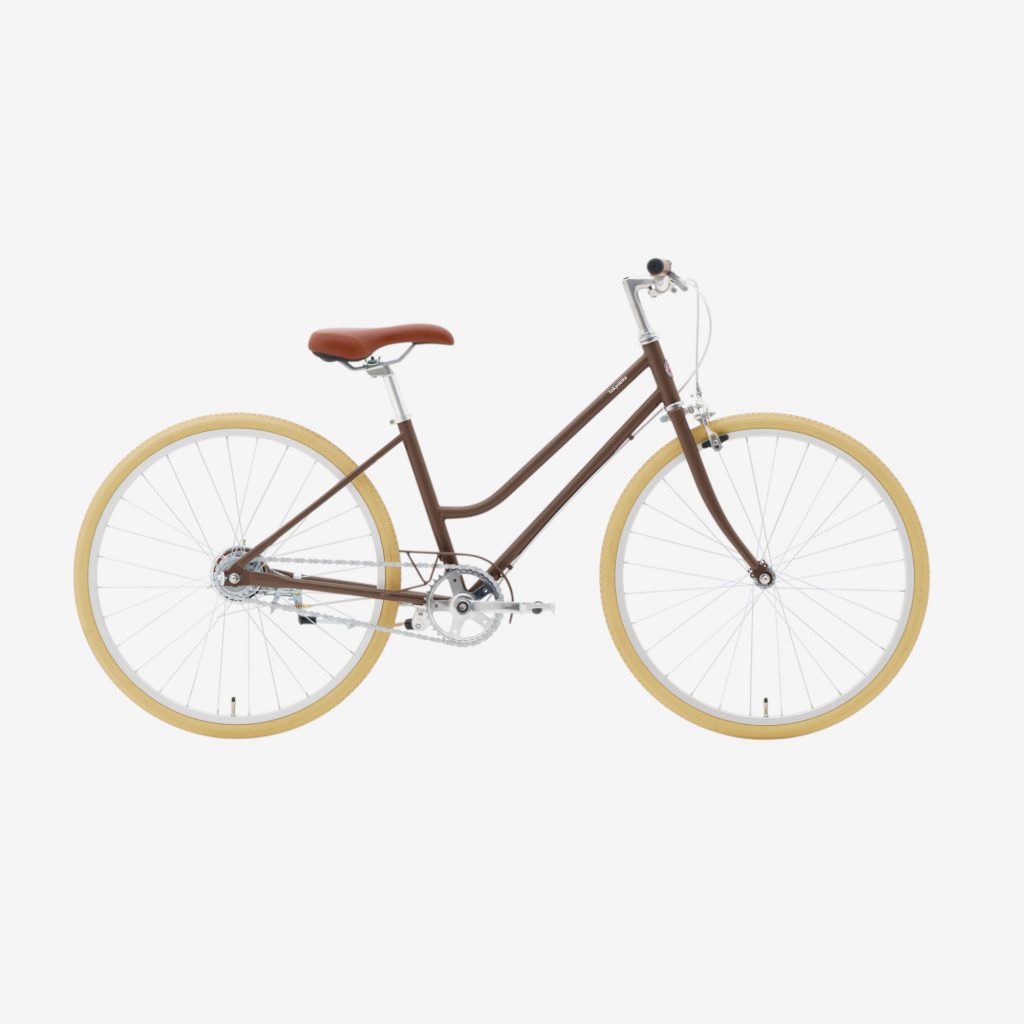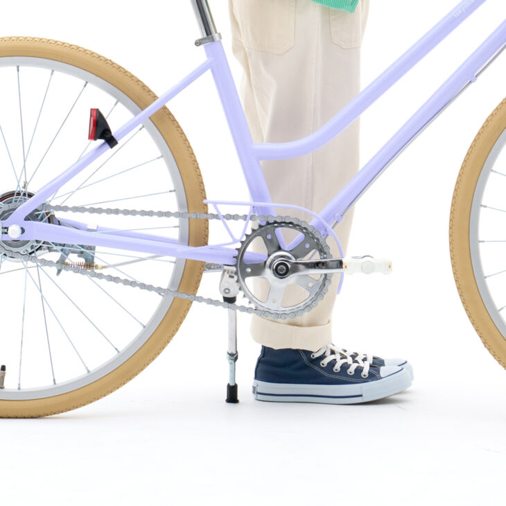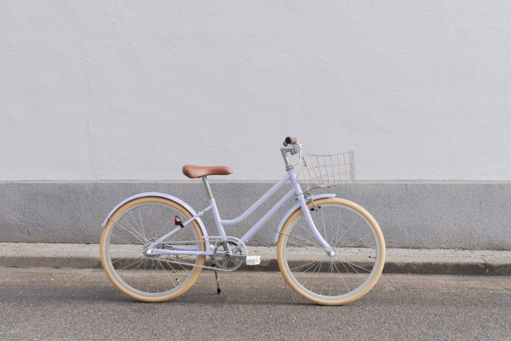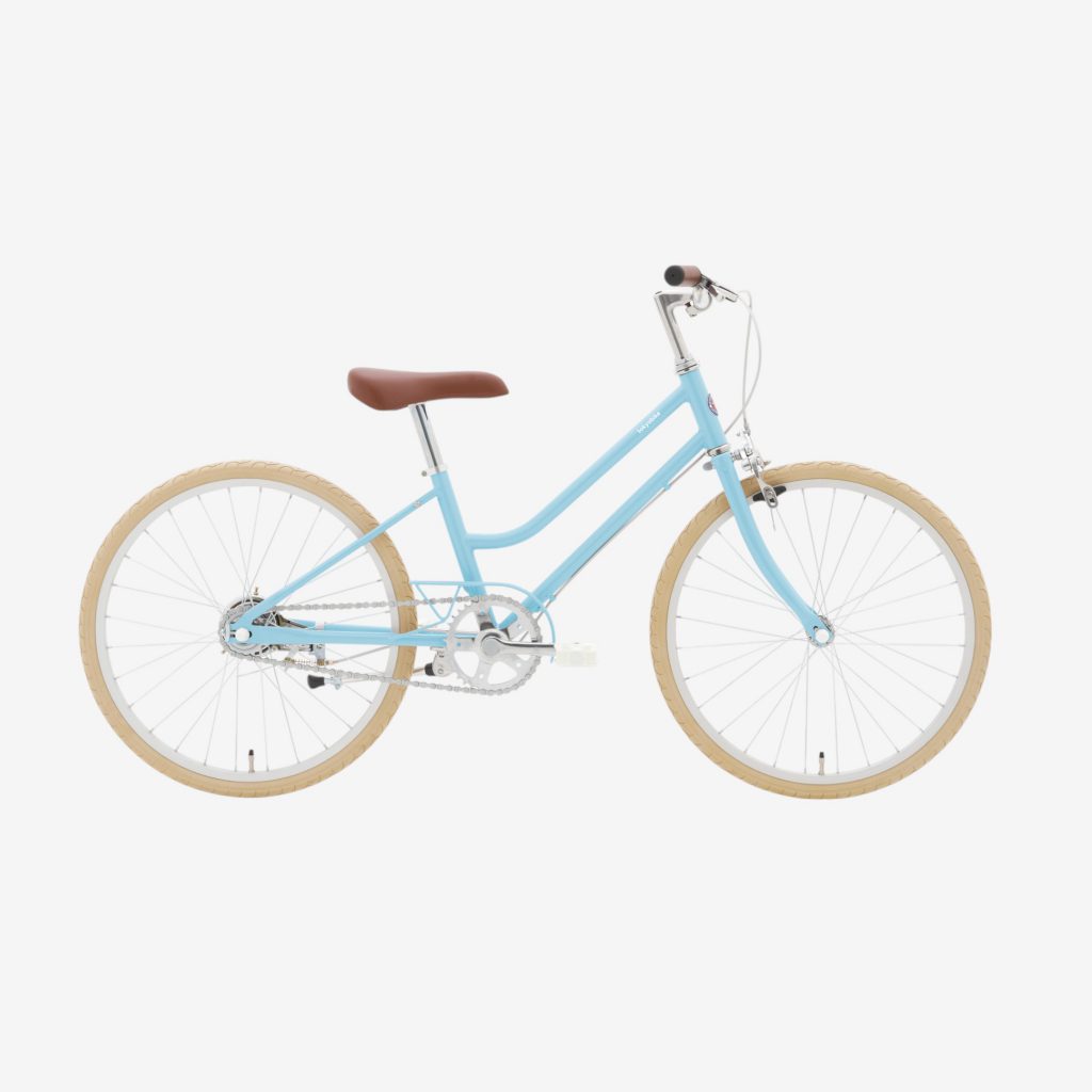 またぎやすい形で乗り降りしやすく、アイボリーカラーのタイヤがやさしい雰囲気を引き立てます。変速のないシンプルなつくりで、こどもの力でも軽やかにこぎ出せます。