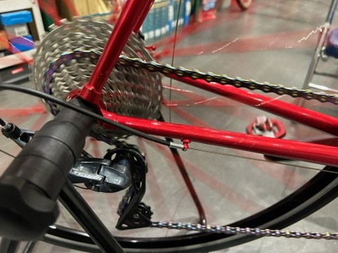 クロスバイクが倒れてディレイラーハンガーが曲がってしまったことにより、走行中にリアディレイラーがリアホイールの中に入ってしまって破損した修理を行いました。