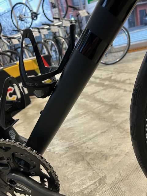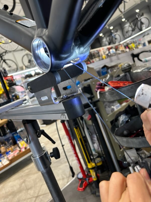 シフトワイヤーをフレーム内に通します。ダウンチューブ内で左右のワイヤーが交差しないように気を付けます。