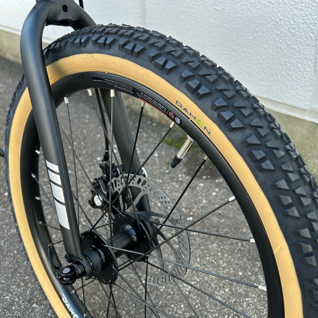マットブラックカラーのフレームに、タンカラーのセミブロックタイヤを標準装備した限定モデルが緊急入荷しました!メカニカルディスクブレーキ仕様、シマノ8段変速仕様です。