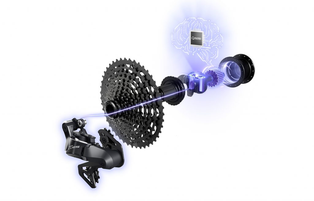 リアハブに内臓された各種センサーで変速タイミングを判断し、外付けリアディレーラー を自動で動かして変速する。