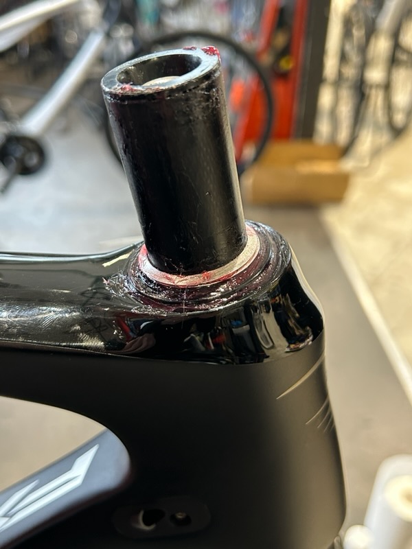 ヘッドベアリングにグリスを塗ってフロントフォークを取り付けます。